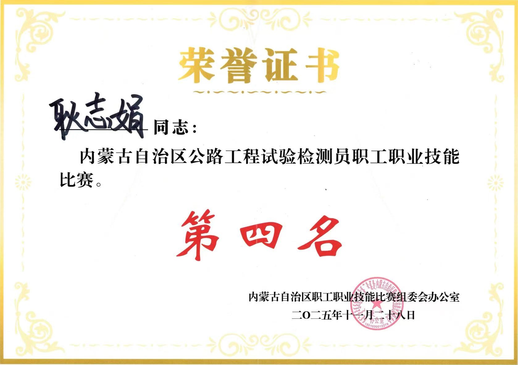 2025年11月28日,为期3天的“建工‘十四五’奋进新征程”内蒙古自治区公路工程试验检测员职工职业技能比赛圆满落幕。检测中心参赛选手凭借扎实的检测功底和卓越的专业素养,在激烈角逐中脱颖而出,斩获个人第二名、第四名、第五名的优异成绩。